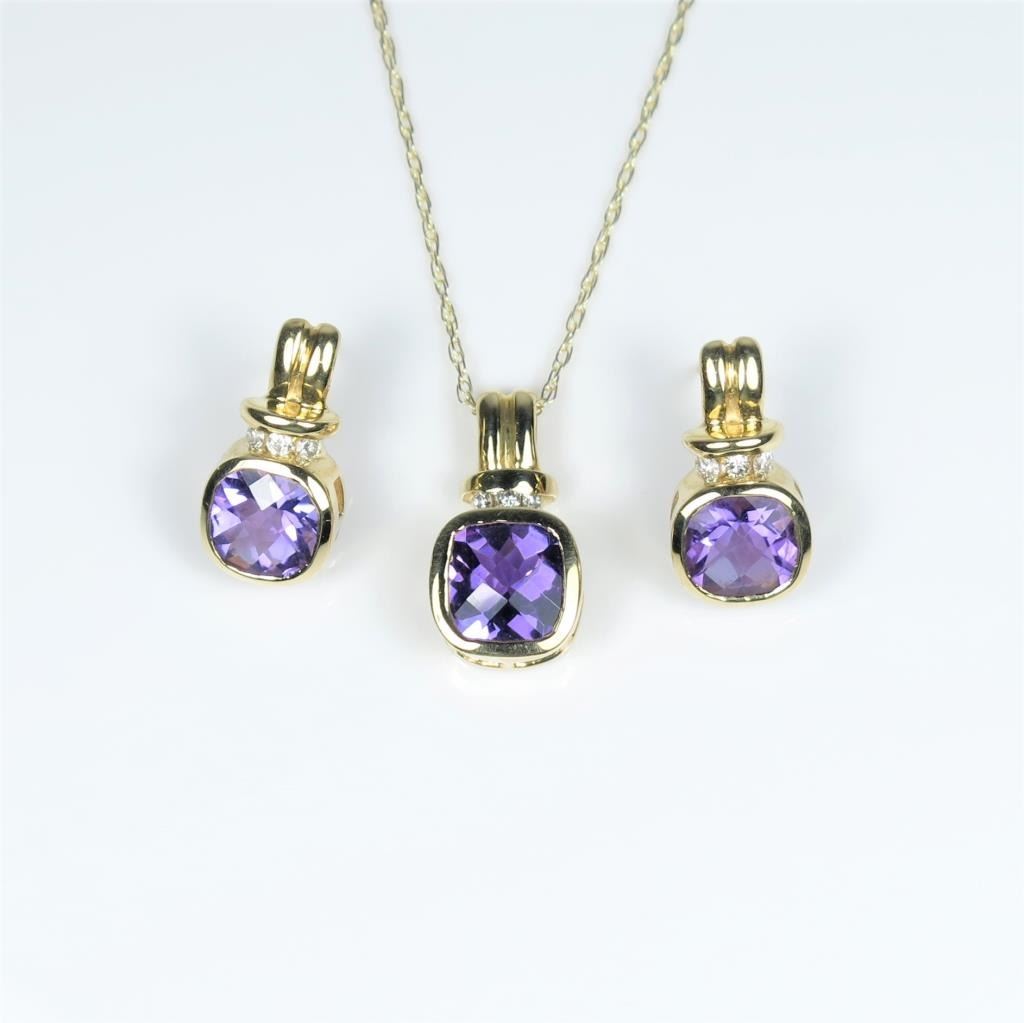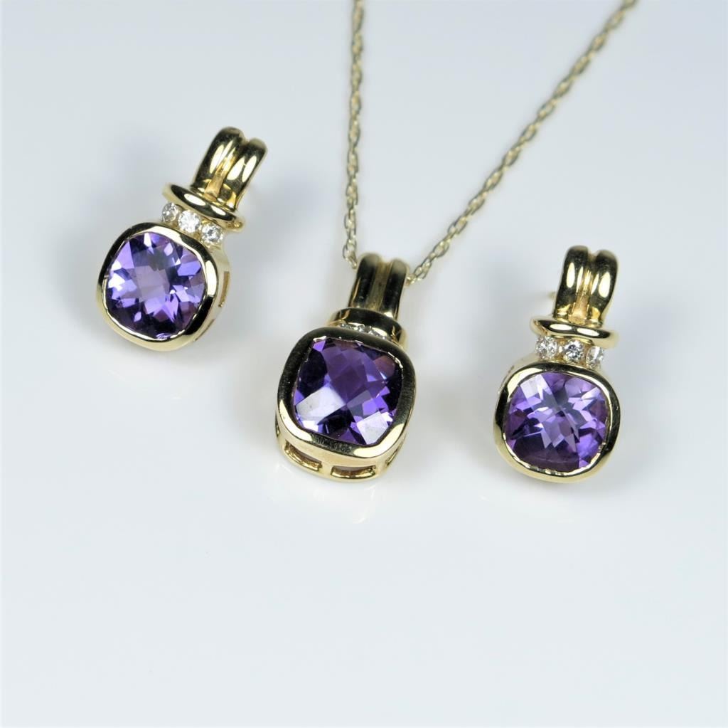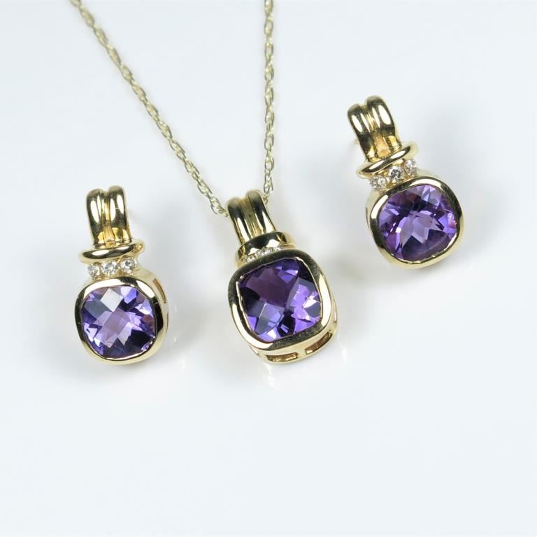 Stylish Amethyst and Diamond Pendant and Earring Ensemble featuring 3 checkerboard cut Amethyst accented with channel set Diamonds crafted in 14 karat yellow gold. Retail $1,500-$2,000 Estimates $800-$1,200