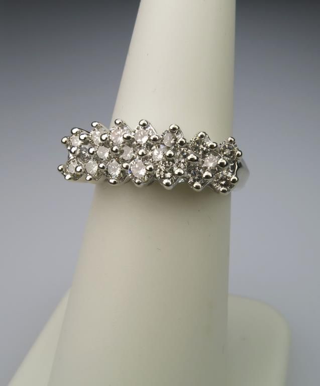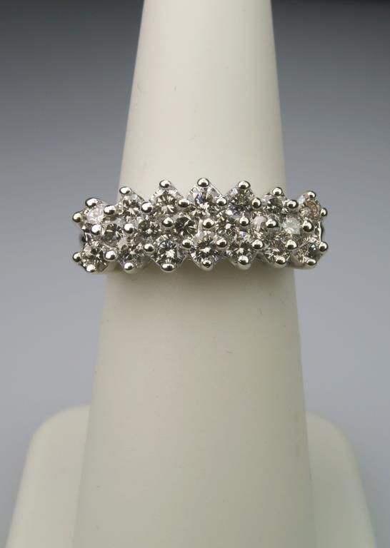 Stylish Diamond Ring with 20 round cut Diamonds weighing approx. 1.00 carat with G-H color and SI clarity set in 14 karat white gold. Retail $1,800-$2,200 Estimate $1,000-$1,500