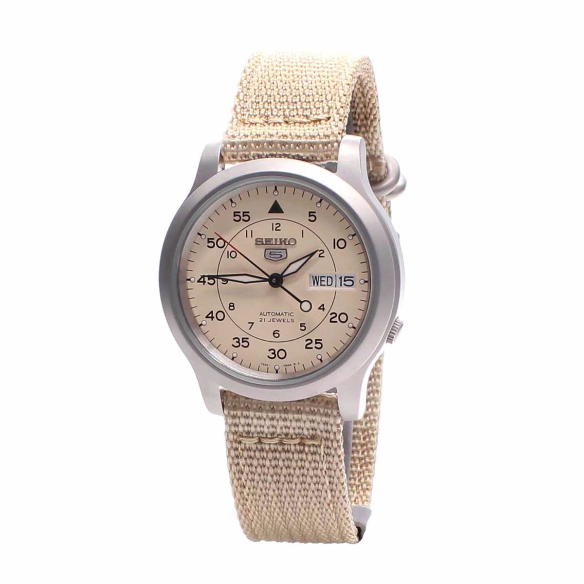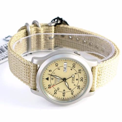 Stylish Sports Seiko Automatic Watch; Dial Color-Cream Dial;Style- Sport;DisplayAnalogCase diameter-37 (crown) x 36 x 11 mm (thickness);Face Height-30 mm;Lug Width-18 mm;Max Length-210 mm Circumference;Water Resistant-30 Meter 3 Bar;Movement-Mechanical : Automatic;Movement Code-CaseStainless-Steel Case;Bracelet-Nylon Strap;Bracelet ColorBrown;ClaspBuckle;Caseback-See Through;Dial Glass-Hardlex
