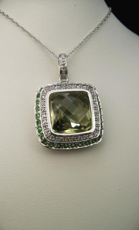 Stylish Square Green Quartz, Fine Green Tourmaline and Diamond Pendant set with checkerboard cut green Quartz weighing approx. 10.00 carats accented with 44 round cut Diamonds and 30 round cut green Tourmaline set in 14 karat white gold.Retail $1,600-$2,000 Estimate $800-$1,200 Very Labor Intensive.