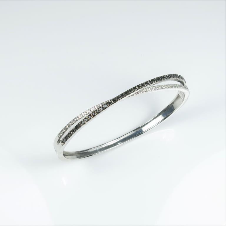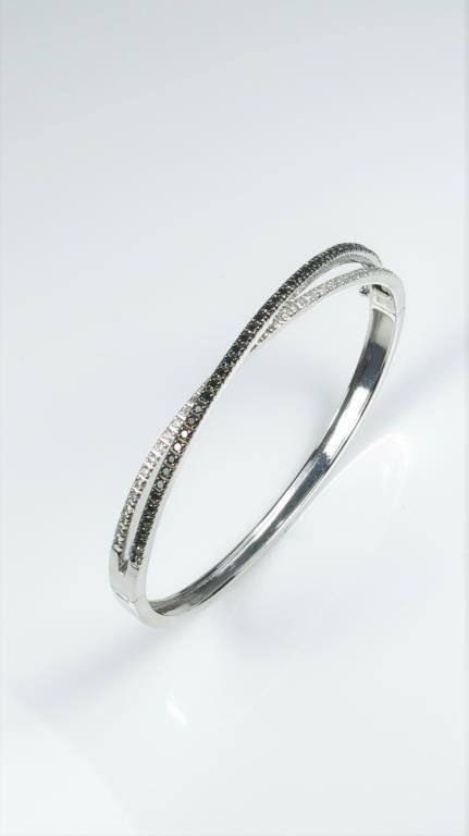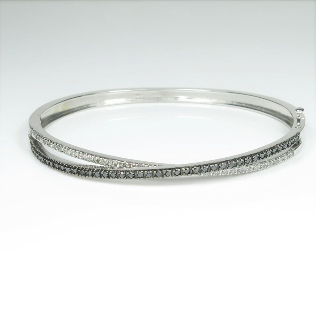 Stylish White and Black Diamond Bangle Bracelet with crossover design featuring combination of 82 round cut Black and White Diamonds weighing approx. 1.50 carats set in hinged 14 karat white gold bracelet. Retail$2,500-$3,000 Estimates $1,500-$2,000