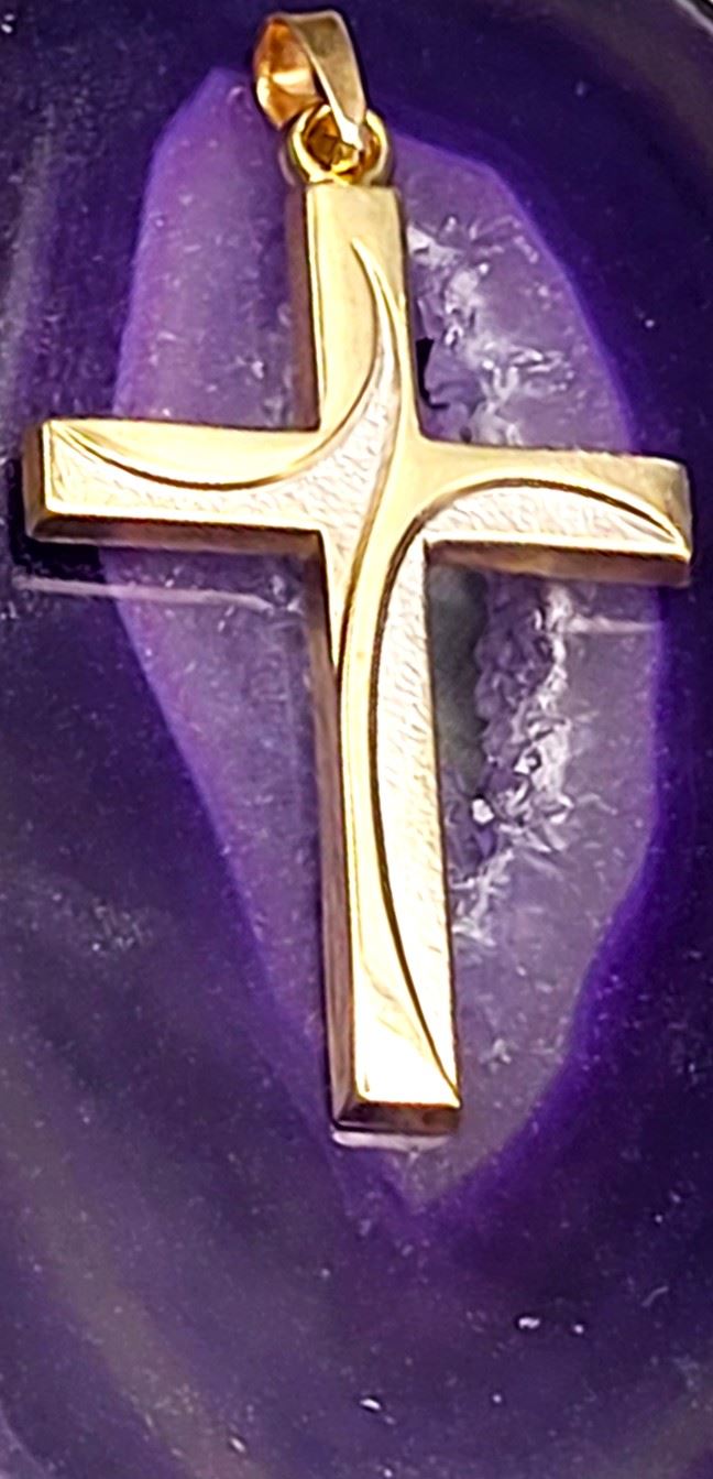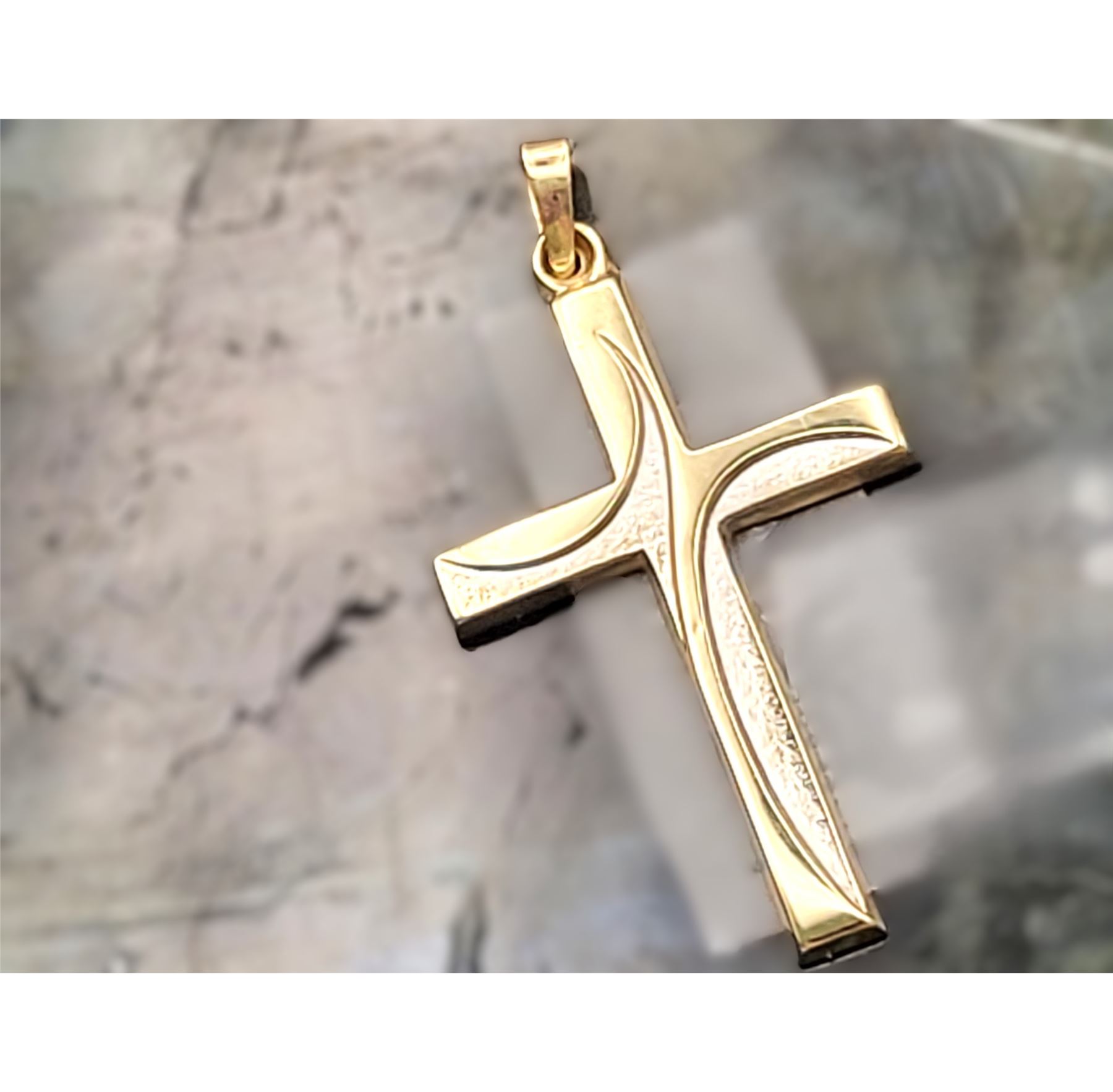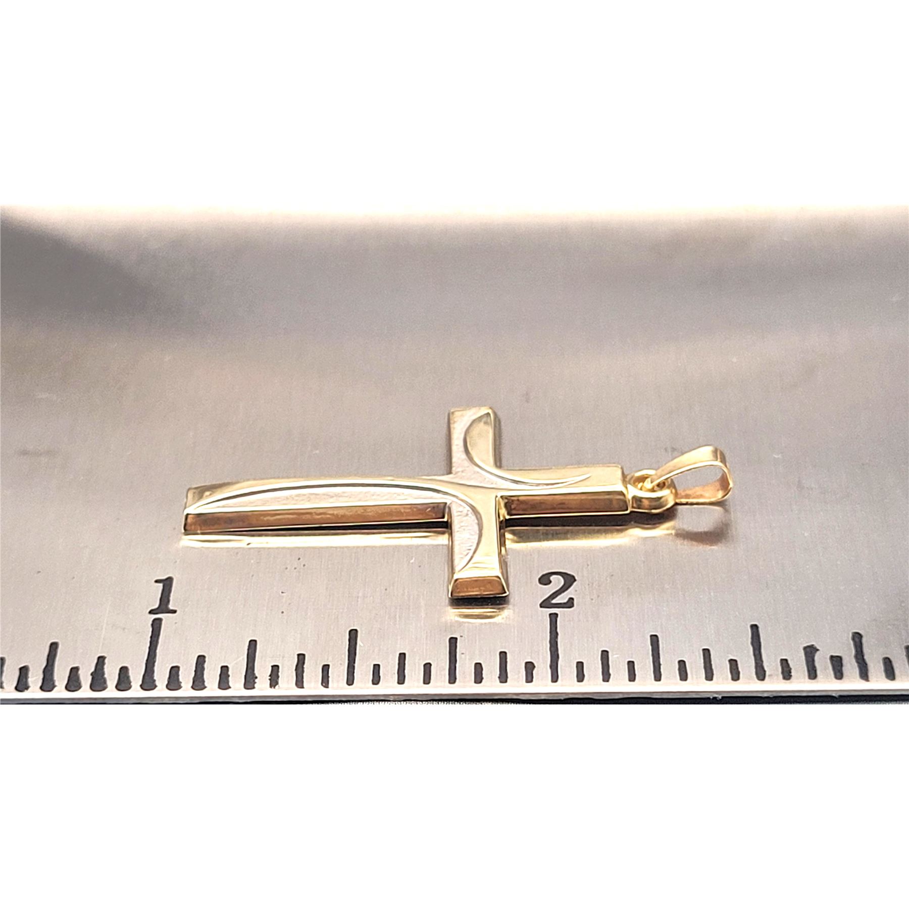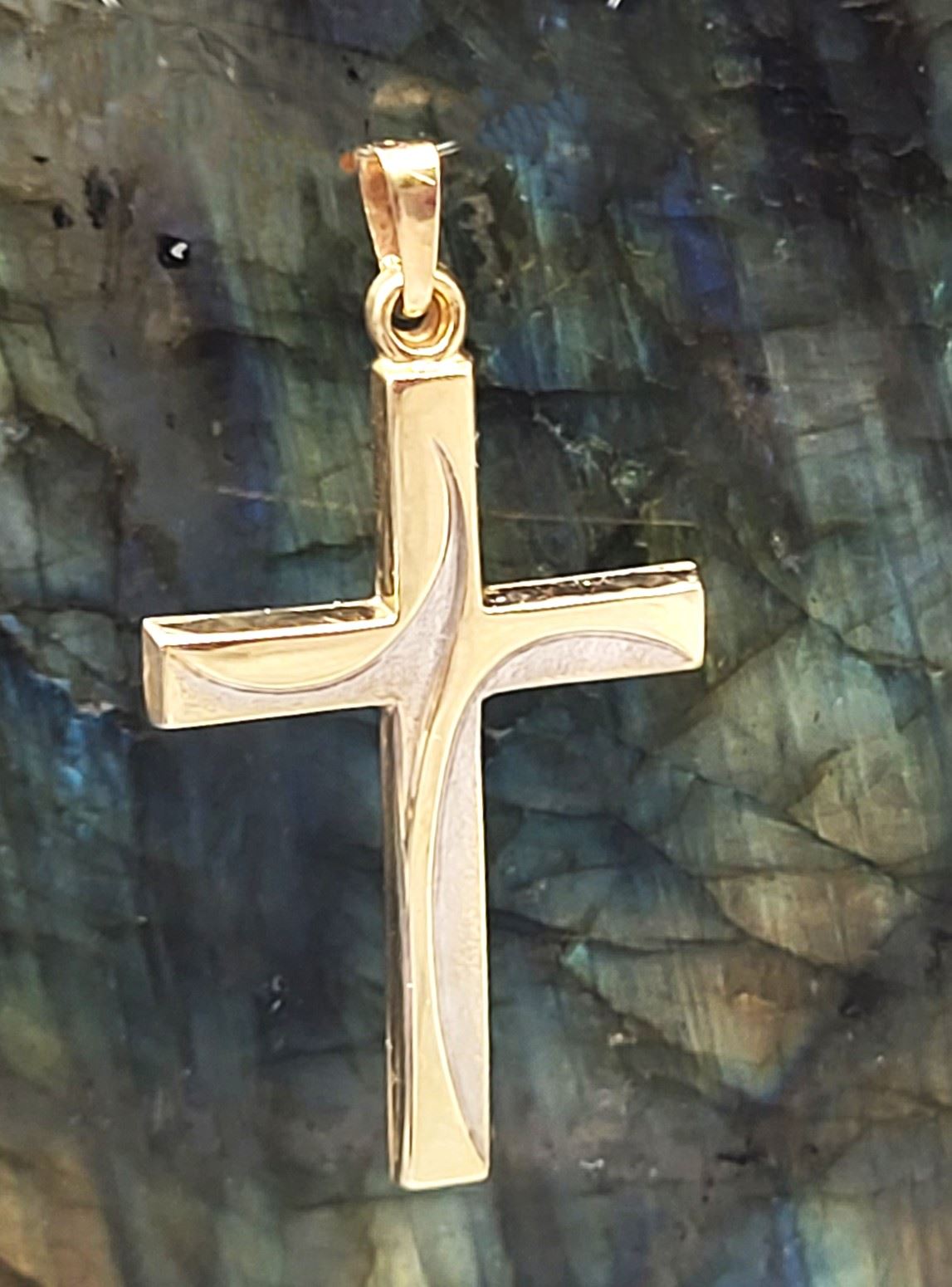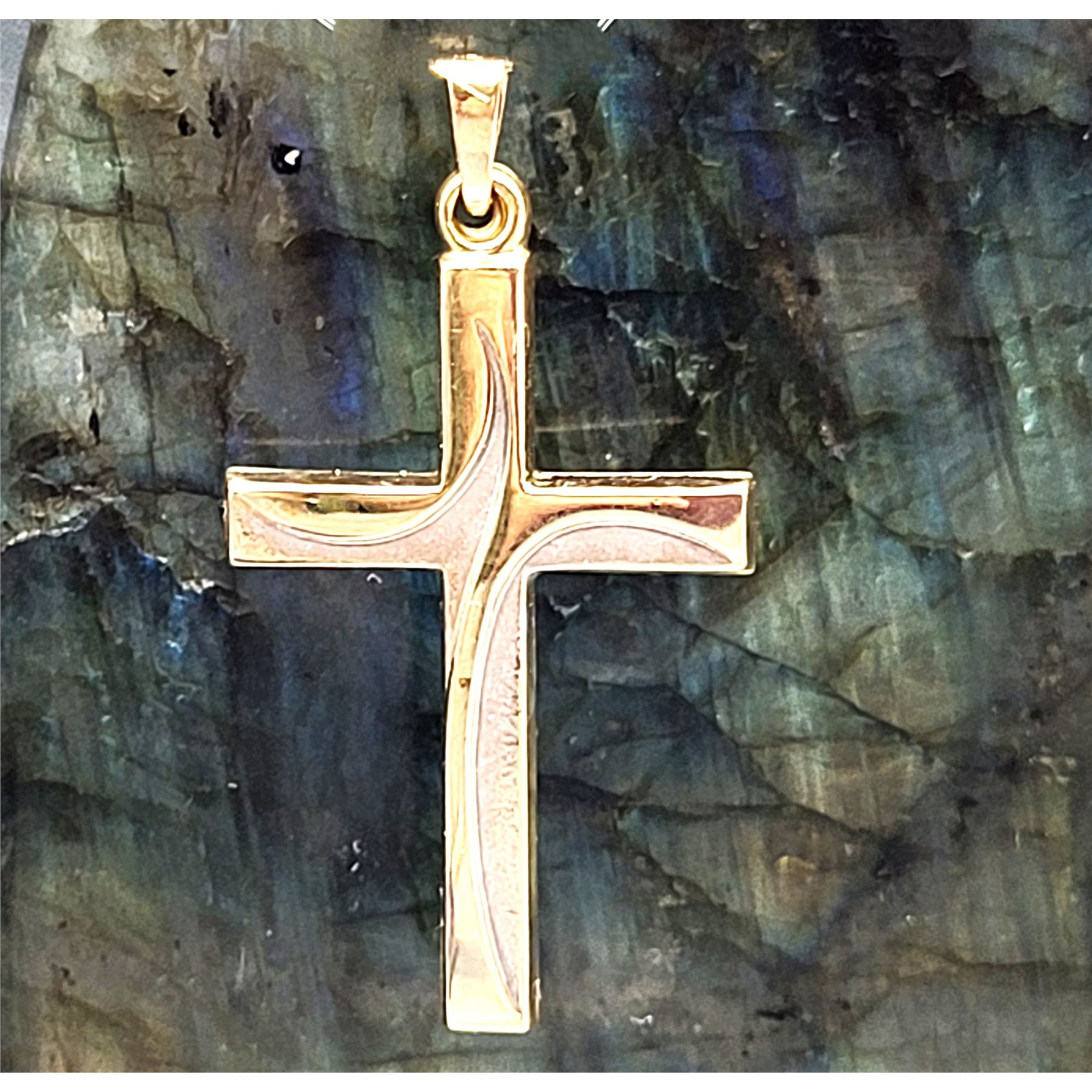 This 14 karat two-tone gold cross is modestly-sized, yet so attractive with the raised, swirled, bypass representation of the crucifix.& nbsp; The swirled design joins smooth, polished yellow gold with finely textured white gold.& nbsp; The cross is approximately 1.5& quot; x .75& quot; and has a solid bail that can accommodate an approximate 2.75mm chain.& nbsp; The pendant is stamped with the gold quality and hallmark on the back. Admin: TV4/og
