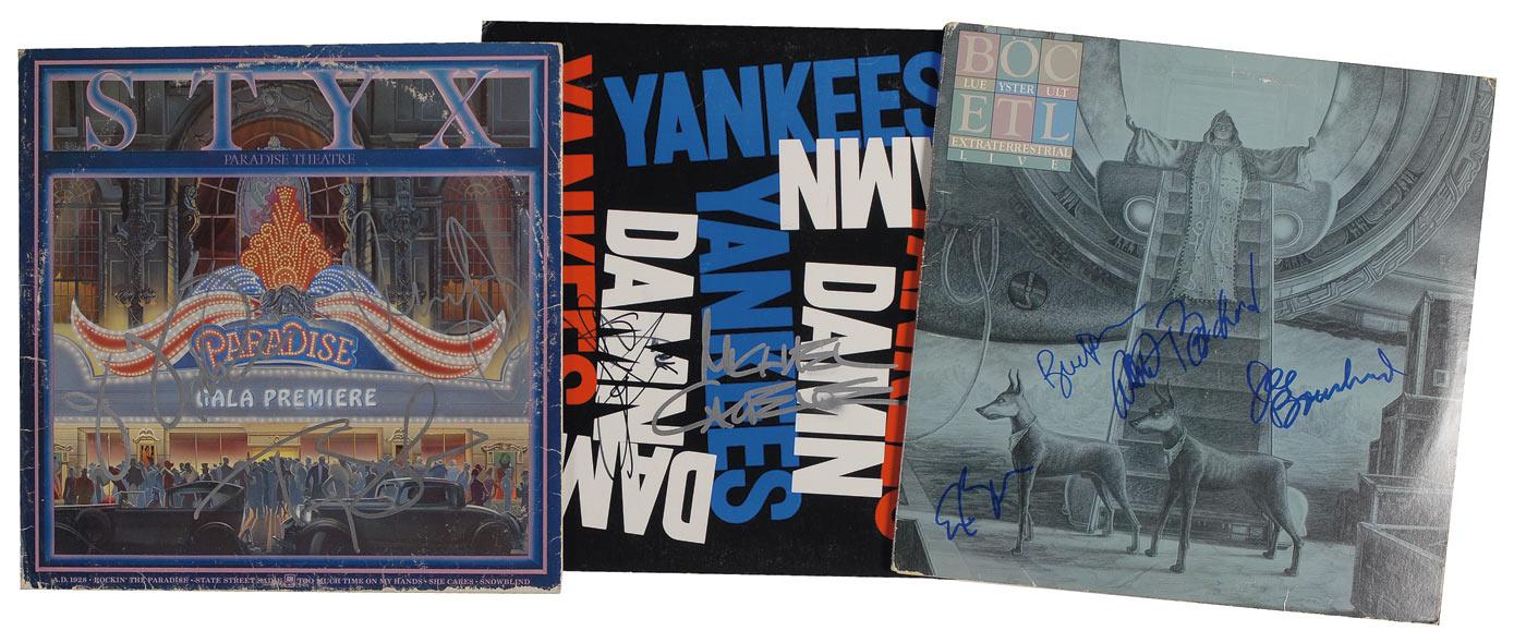 Three items: Paradise Theatre album signed in silver ink by James Young, Tommy Shaw, Dennis DeYoung, and Chuck Panozzo; Extraterrestrial album signed in blue felt tip by four members of Blue Oyster Cult; and a Damn Yankees album flat signed by Jack Blades and Michael Cartellone. In very good condition.