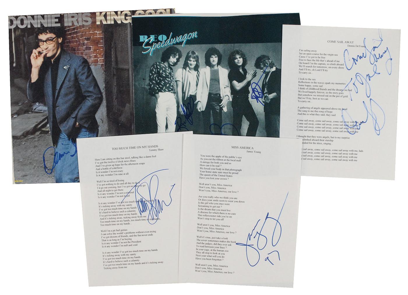 Five items: three souvenir printed lyrics to ‘Come Sail Away,’ ‘Too Much Time on My Hands,’ and ‘Miss America’ on separate off-white 8.5 x 11 sheets, respectively signed in blue felt tip “Come Sail Away to Joe, Dennis DeYoung,” “Tommy Shaw,” and “James Young 97”; King Cool album signed in blue felt tip by Donnie Iris; and an REO Speedwagon Hi Infidelity inner sleeve signed by Kevin Cronin, Bruce Hall, and Neil Doughty. In overall very good to fine condition with scattered creasing and surface wear to the album and sleeve. The album is included.