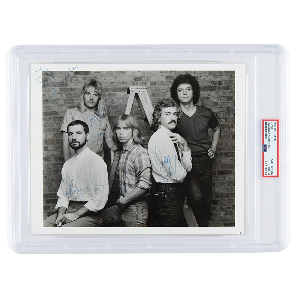 Excellent early glossy 10 x 8 photo of Styx posing with a ladder in front of a brick wall, signed in ballpoint by the band& rsquo;s original lineup of Dennis DeYoung, James Young, who adds the inscription, & ldquo;To J. J., best wishes,& rdquo; John Curulewski, Chuck Panozzo, and John Panozzo. In fine condition. Encapsulated in a PSA/DNA authentication holder.