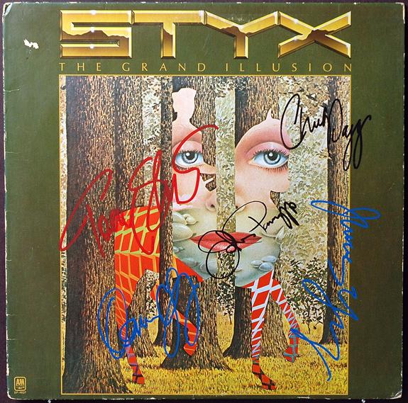 Styx - "The Grand Illusion" Signed Album Cover. Hand signed by all five members: Dennis DeYoung, John Panozzo, Tommy Shaw, James Young, and Chuck Panozzo. DeYoung and Young signed with a blue marker, John and Chuck Panazzo with black, and Shaw with red. in black, blue, and red marker.The album was released in 1977 by A&M Records and went Triple Platinum. "Come Sail Away" became a hit single. Light wear to cover edges. Album is present.