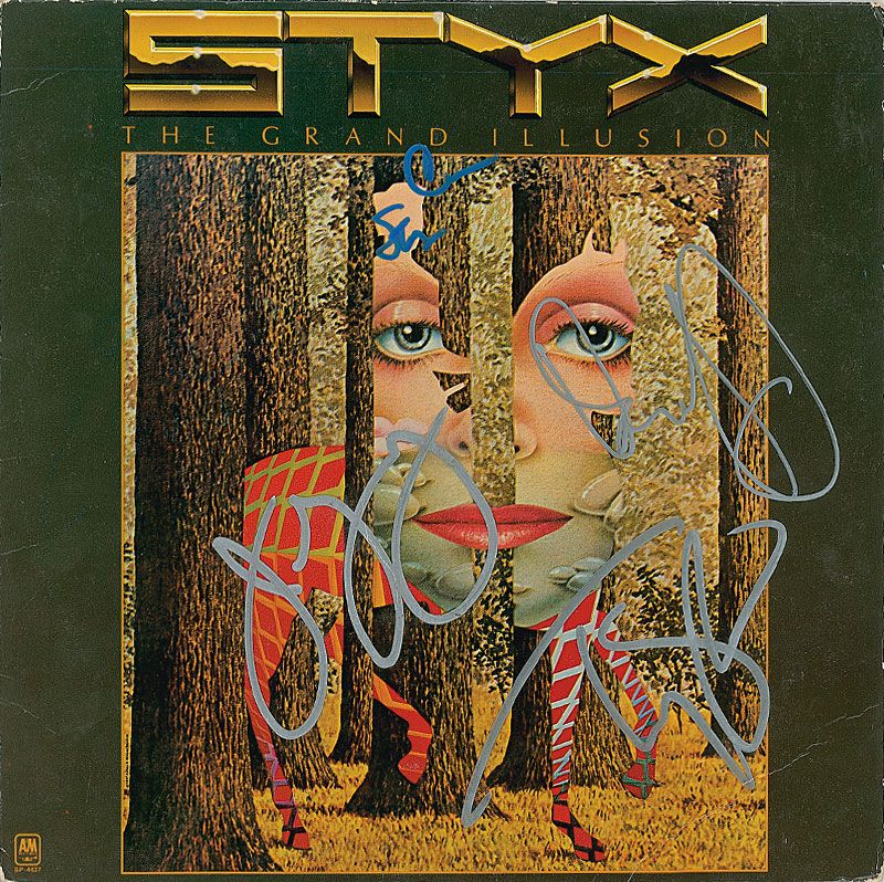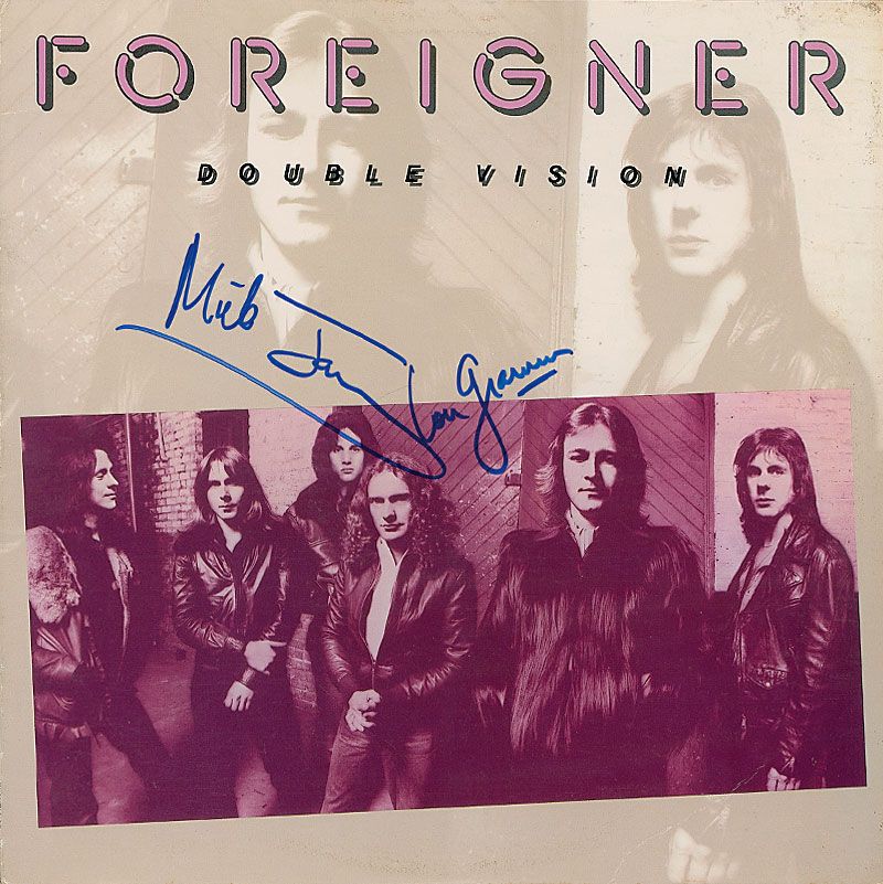 Two albums: The Grand Illusion signed on the front cover in blue and silver ink by Tommy Shaw, James Young, Dennis DeYoung, and one other; and Double Vision signed on the front cover in blue felt tip by Mick Jones and Lou Gramm. Partial separation to lower edge of the Styx album and a couple creases to both, otherwise overall fine condition. The records are included.