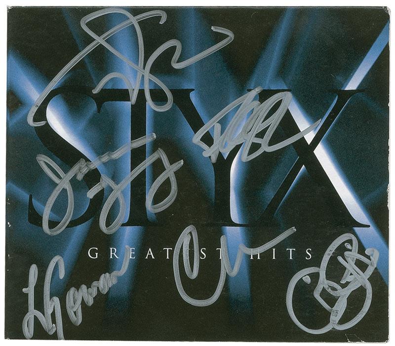 Greatest Hits CD signed on the front cover in silver ink by Tommy Shaw, James Young, Ricky Phillips, Lawrence Gowan, Chuck Panozzo, and Todd Sucherman. In fine condition. The CD is included.
