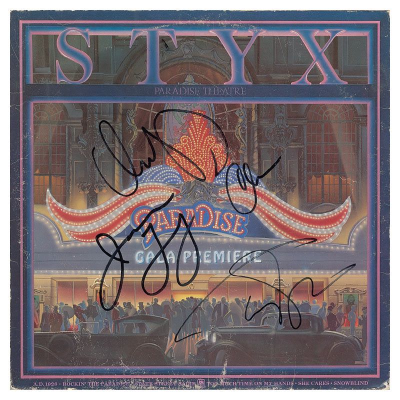 Paradise Theatre album signed on the front in black felt tip by Dennis DeYoung, Tommy Shaw, James ‘JY’ Young, and Chuck Panozzo. In very good condition, with scattered surface and edge wear, mild creasing, and light ‘rings of wear.’ The record is included.