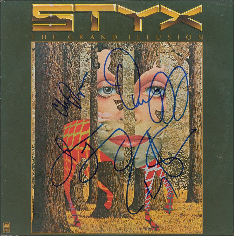 The Grand Illusion album signed on the front cover in blue felt tip Dennis DeYoung, Tommy Shaw, Chuck Panozzo, and James Young. A James Spence authentication label affixed to back corner, scattered creases and impressions, and a mild ‘ring of wear’ to covers, otherwise fine condition. The record is included.