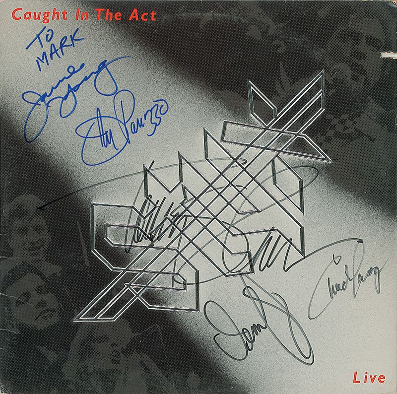 Caught in the Act album signed on the front cover in blue and black felt tip by original members James Young (ins), Dennis DeYoung, Chuck Panozzo, and John Panozzo, and also signed by Tommy Shaw. In fine condition, with a few creases to the left side, light ‘ring of wear,’ and discount cut to the upper right. The record is included.