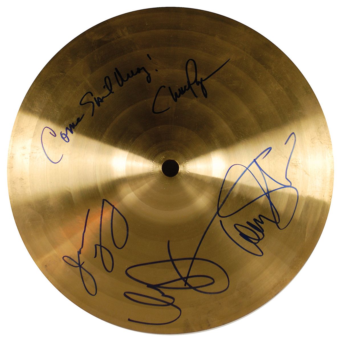 Gold 8? cymbal, signed on the top in blue felt tip by Dennis DeYoung, Tommy Shaw, James ‘JY’ Young, and Chick Panozzo, who adds “Come Sail Away.” In fine condition, with some scattered light fingerprints to edges.