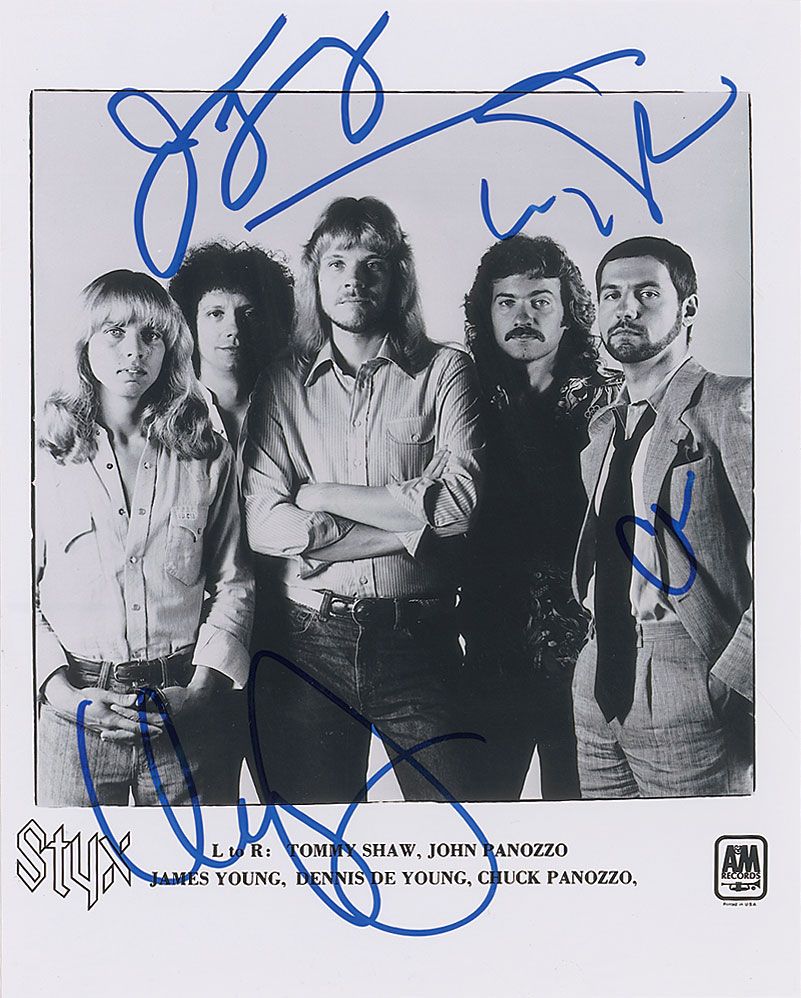 Glossy 8 x 10 A & M Records promotional photo, signed in blue felt tip by Tommy Shaw, James ‘JY’ Young, Chuck Panozzo, and Dennis DeYoung. In fine condition.