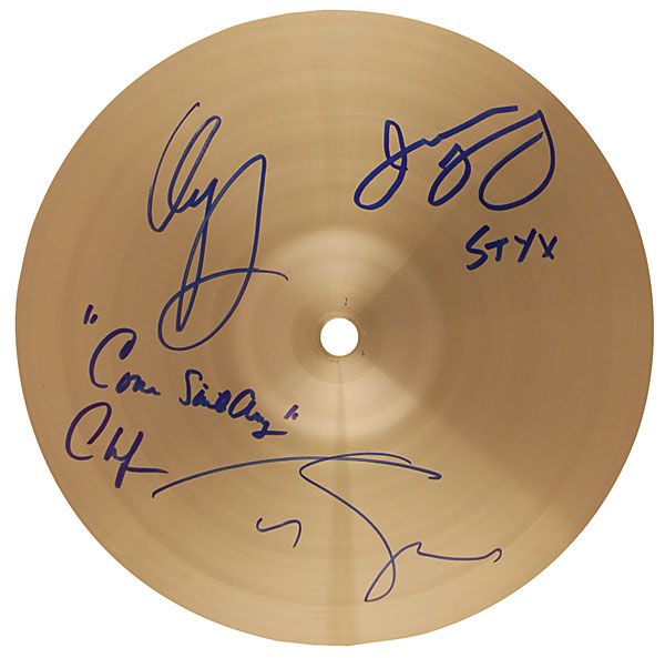 Bright gold 10? cymbal, signed on the top in blue felt tip by Tommy Shaw, Dennis DeYoung, James ‘JY’ Young, and Chuck Panozzo, who adds “Come Sail Away.” In fine condition.