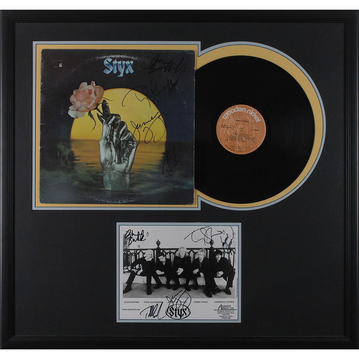 Two items: Best of Styx album, signed on the front cover in black felt tip by Glen Burtnik, Todd Sucherman, James Young, Tommy Shaw and Lawrence Gowan; and a glossy 10 x 8 promotional group photo, signed in black felt tip by Glen Burtnik, Todd Sucherman, James Young, Tommy Shaw and Lawrence Gowan. Both are double-matted and framed together to an overall size of 29 x 27.5. Moderate ‘ring of wear’ to album cover and a light brush to Sucherman’s signature on the photo, otherwise fine condition. Oversized.
