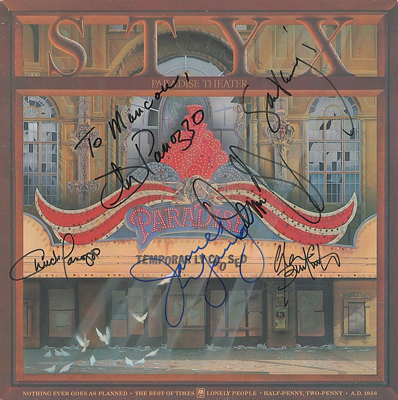 Paradise Theater album signed on the front cover in blue and black felt tip by Dennis DeYoung, Chuck Panozzo, John Panozzo (ins), James Young, and Glen Burtnik. In fine condition. The record is included. Accompanied by an Edge of the Century aftershow pass.