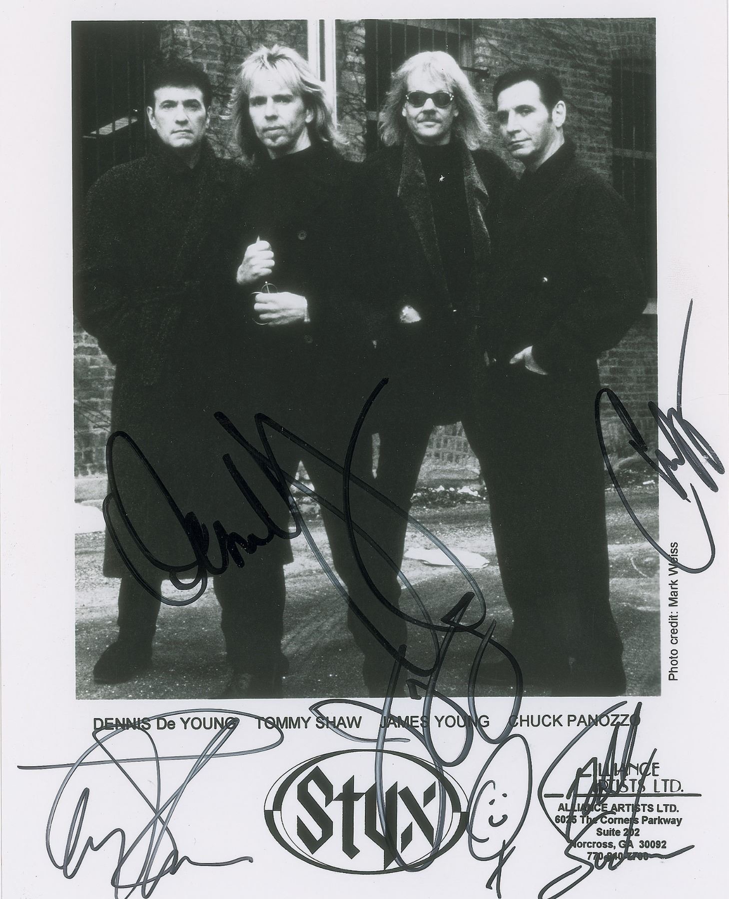 Glossy 8 x 10 publicity photo of Styx, signed in black felt tip by Dennis DeYoung, Chuck Panozzo, James Young, Tommy Shaw, and Todd Sucherman. In very good to fine condition, with a central horizontal bend.