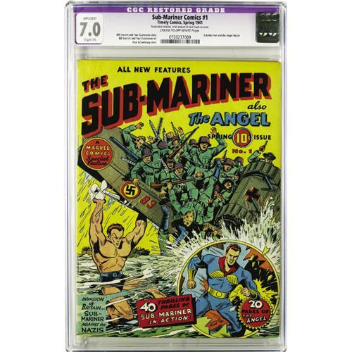 <B>Sub-Mariner Comics #1 (Timely, 1941) CGC Apparent FN/VF 7.0 Slight (P) Cream to off-white pages.</B></I> As this is one of the most sought-after Timely books, don't let the purple label put you off, especially since it's only got slight restoration. Look at all you're getting for your bidding dollar: a great "upsy-Nazi" cover by Alex Schomburg, a Sub-Mariner story drawn by his creator Bill Everett, and an Angel adventure as well. No wonder this issue is ranked among the 20 most valuable comic books by Overstreet. CGC notes, "Restoration includes: small amount of color touch on cover." Overstreet 2006 GD 2.0 value = $2,750; VG 4.0 value = $5,500; FN 6.0 value = $8,250; VF 8.0 value = $22,000.