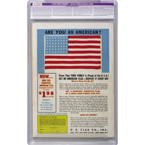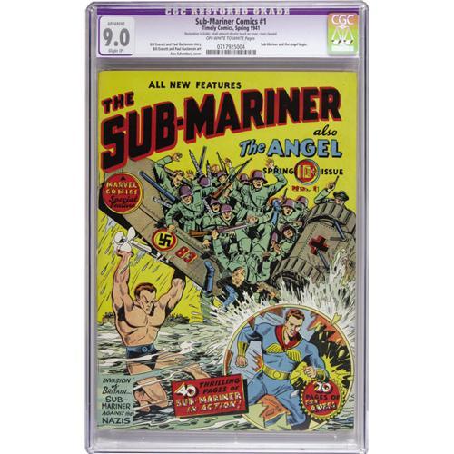 <B>Sub-Mariner Comics #1 (Timely, 1941) CGC Apparent VF/NM 9.0 Slight (P) Off-white to white pages.</B></I> Ranked among the 20 most valuable comic books by Overstreet, this is one of the most hotly desired Timelys. The Sub-Mariner got his own book after being a smash success in the pages of <B>Marvel Mystery Comics</B></I>, and his cohort from that title, the Angel, joined him in this new series. Subby's adventures were drawn by his creator Bill Everett, and the cover was the work of Timely's talented Alex Schomburg. CGC notes, "Restoration includes: small amount of color touch on cover, cover cleaned." Overstreet 2006 GD 2.0 value = $2,750; VG 4.0 value = $5,500; FN 6.0 value = $8,250; VF 8.0 value = $22,000; VF/NM 9.0 value = $38,500.<BR><BR><b>Shipping:</b> Slabbed Comic (<a target="_blank" href="http://www.heritageauctions.com/common/shipping.php">view shipping information</a>)
