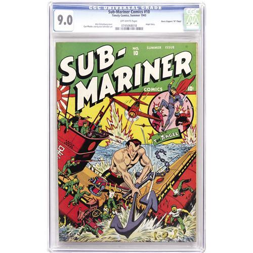 <B>Sub-Mariner Comics #10 Davis Crippen ("D" Copy) pedigree (Timely, 1943) CGC VF/NM 9.0 Off-white pages.</B></I> The great-looking spine will make you think "this was never read," and we believe that to be the case as well! See cover artist Alex Schomburg at the top of his form here. In addition to the Sub-Mariner's exploits, this issue has a rare cover appearance by the Angel, who also stars in his own 16-page adventure. Overstreet 2006 VF/NM 9.0 value = $2,525; NM- 9.2 value = $3,450. CGC census 6/06: 2 in 9.0, none higher. <I>From the Crippen Collection.</B></I> <BR><BR><B>Important notice:</B> Heritage usually auctions material at the rate of 200-250 lots per hour. On some occasions eBay Live bid software or the Internet may not be able to keep up with the pace of the auction. We recommend placing a realistic absentee bid now as insurance to avoid disappointment. Occasionally the auctioneer may eliminate or reject an eBay Live bid, and the auctioneer may also reopen a lot after the close of the eBay live bidding (usually because we missed an audience bid), and may reject your bid even if it shows you as the winning bidder. By bidding via eBay Live, you agree that Heritage may award the lot to another bidder at its sole discretion under the circumstances described above or any other reasonable circumstances. Since eBay bids are not shown to us until we open the lot on the floor, we treat those bids just like floor bids. In most cases the floor responds before the eBay bid is presented to us, due to Internet lag time, so for consistency we have made it a policy that floor bids are always considered first over tie eBay live bids. Also please note that all Heritage lots purchased through eBay Live carry a 22.5% Buyer's Premium. Please make sure you read the Terms and Conditions before you bid. This lot is being auctioned in conjunction with a live floor auction by Heritage Auction Galleries. All final auction and invoice information will be supplied by Heritage Auction Galleries, and all other information should be considered preliminary. Lot:41001 <BR><BR><B>Winning Notification and Billing:</B> After the FINAL session in this auction is complete, Heritage will send e-mail and snail mail invoices. This process normally takes several days. All final auction and invoice information will be supplied by Heritage Auction Galleries, and all other information should be considered preliminary. <BR><BR>This auction will be conducted on a live auction floor and over the Internet through eBay Live. If you choose to place an absentee bid, please take a moment to <font color='#0000ff'><u><a href='http://pages.ebay.com/liveauctions/help/before/laabsentee.html'>learn how eBay Live absentee bidding works</a></u></font><font color='#000000'>
