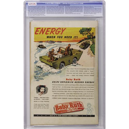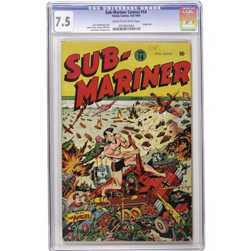 <B>Sub-Mariner Comics #14 (Timely, 1944) CGC VF- 7.5 Cream to off-white pages.</B></I> Since D-Day occurred about the same time as this issue was released (it's cover-dated Fall 1944, but comics were always dated a couple of months in advance), we assume this was Alex Schomburg's fantasy image of an amphibious attack by the Allies. Whatever the case, it's like all of the best Schomburg covers in that you can scrutinize it for quite a while and keep noticing new things. Highly collectible stuff! Overstreet 2006 VF 8.0 value = $1,138. CGC census 10/06: 1 in 7.5, 4 higher.<BR><BR><b>Shipping:</b> Slabbed Comic (<a target="_blank" href="http://www.heritageauctions.com/common/shipping.php">view shipping information</a>)