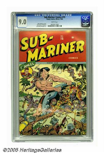 <B>Sub-Mariner Comics #15 (Timely, 1944) CGC VF/NM 9.0 White pages.</B></I> Our aquatic hero comes ashore to rip the roof off an enemy "pillbox" as only he can (grown to about twice size, that is). Yes, of course, this is an Alex Schomburg World War II cover illustration -- isn't it great? Note the circular insert, featuring the Angel, who helps out by firing a shot at the soldier attacking Subby! Nowhere but Timely will you find a cover like this! This freshly-slabbed copy just beat out all others for the number one position in CGC's current census for this issue. Overstreet 2005 VF/NM 9.0 value = $1,666; NM- 9.2 value = $2,250. CGC census 7/05: 1 in 9.0, none higher.