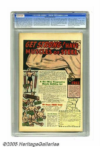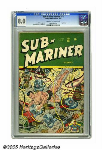 <B>Sub-Mariner Comics #18 (Timely, 1945) CGC VF 8.0 Cream to off-white pages.</B></I> On this cool cover, artist Alex Schomburg takes the action underwater, as Sub-Mariner (with the aid of a friendly shark) stops a plot to salvage sunken American gold reserves. The Angel co-stars with another solo adventure inside. This copy looks very sharp and attractive, maybe a little better than the grade suggests -- but who are we to argue with CGC? Overstreet 2005 VF 8.0 value = $875. CGC census 7/05: 1 in 8.0, 2 higher.