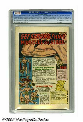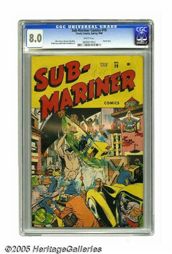 <B>Sub-Mariner Comics #19 (Timely, 1946) CGC VF 8.0 White pages.</B></I> Subby is at it again on this early post-war cover; only instead of a Nazi U-boat, he's hoisting a fishing ship in the air, dumping its cargo of warehouse crooks into the harbor. That man with the pencil-thin 'stache, the Angel, also appears. Among the artists listed are a young Carmine Infantino, moonlighting from his day job over at DC. This colorful copy is very pleasing, and should make some lucky bidder quite happy. Overstreet 2005 VF 8.0 value = $875. CGC census 7/05: 1 in 8.0, 6 higher.