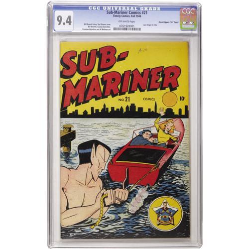 <B>Sub-Mariner Comics #21 "D" Copy pedigree (Timely, 1946) CGC NM 9.4 Off-white pages.</B></I> This copy has sharper corners and a nicer overall appearance than the Ohio copy (which is the other 9.4 book on the census). This copy and the #24 we're offering are both newly certified, and they're from the first batch of "D" copies that came to the market, before the name Davis Crippen was known to the collecting world at large. The issue's cover is by Syd Shores. Overstreet 2006 NM- 9.2 value = $1,500. CGC census 9/06: 2 in 9.4, none higher.<BR><BR><b>Shipping:</b> Slabbed Comic (<a target="_blank" href="http://www.heritageauctions.com/common/shipping.php">view shipping information</a>)