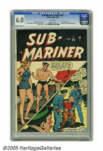 <B>Sub-Mariner Comics #26 (Timely, 1948) CGC FN 6.0 White pages.</B></I> Namora cover and story appearance; Blonde Phantom story. Art by Bill Everett, Bob Powell, and others. Overstreet 2005 FN 6.0 value = $324. CGC census 6/05: 2 in 6.0, 4 higher.