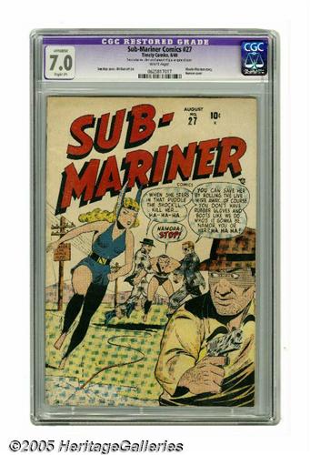 <B>Sub-Mariner Comics #27 (Timely, 1948) CGC Apparent FN/VF 7.0 Slight (P) White pages.</B></I> Namora runs into trouble on this cover -- can Sub-Mariner save her? A Blond Phantom story is also featured. Bill Everett is among the artists for this issue. CGC notes, "Restoration includes: small amount of glue on spine of cover." Overstreet 2005 GD 2.0 value = $108; VG 4.0 value = $216; FN 6.0 value = $324; VF 8.0 value = $675.