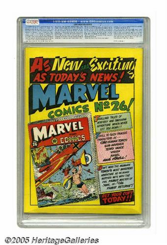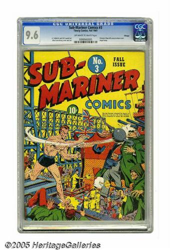 <B>Sub-Mariner Comics #3 Chicago pedigree (Timely, 1941) CGC NM+ 9.6 Off-white to white pages.</B></I> And you thought we'd run out of the outrageously supreme stuff! Au contraire - take this remarkable pedigree copy of one of Timely's most desirable early titles, from the early days of WWII. Alex Schomburg's cover depicting the attempted assassination of Winston Churchill is a classic. Schomburg also worked his magic on the interior, along with Al Gabriele and Bill Everett. To date, CGC hasn't certified another copy of #3 that comes close to our offering. Overstreet 2005 NM- 9.2 value = $6,200. CGC census 7/05: 1 in 9.6, none higher.