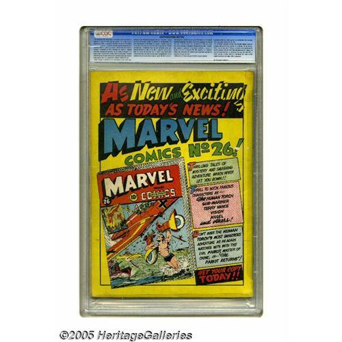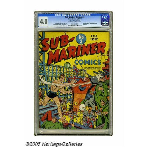 <B>Sub-Mariner Comics #3 (Timely, 1941) CGC VG 4.0 Off-white to white pages.</B></I> Some Axis types are trying to assassinate Winston Churchill! Since the Sub-Mariner doesn't have a word balloon on this cover, let us provide one: ""Here's some blood, toil, tears, and sweat for ya, Rat-zi!"" The cover scene's by Alex Schomburg, of course. Inside the comic, Subby's story is a whopping 40-pager; we wish comics today even <I>had</B></I> 40 pages! CGC notes, ""1 piece of tape on spine of cover."" Overstreet 2005 VG 4.0 value = $846. CGC census 9/05: 1 in 4.0, 8 higher. <BR><BR><B>Important notice:</B> Heritage usually auctions material at the rate of 200-250 lots per hour. On some occasions eBay Live bid software or the Internet may not be able to keep up with the pace of the auction. We recommend placing a realistic absentee bid now as insurance to avoid disappointment. Occasionally the auctioneer may eliminate or reject an eBay Live bid, and the auctioneer may also reopen a lot after the close of the eBay live bidding (usually because we missed an audience bid), and may reject your bid even if it shows you as the winning bidder. By bidding via eBay Live, you agree that Heritage may award the lot to another bidder at its sole discretion under the circumstances described above or any other reasonable circumstances. Since eBay bids are not shown to us until we open the lot on the floor, we treat those bids just like floor bids. In most cases the floor responds before the eBay bid is presented to us, due to Internet lag time, so for consistency we have made it a policy that floor bids are always considered first over tie eBay live bids. Also please note that all Heritage lots purchased through eBay Live carry a 20% Buyer's Premium. Please make sure you read the Terms and Conditions before you bid. This lot is being auctioned in conjunction with a live floor auction by Heritage Galleries & Auctioneers. All final auction and invoice information will be supplied by Heritage