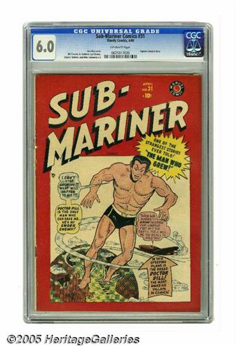 <B>Sub-Mariner Comics #31 (Timely, 1949) CGC FN 6.0.</B></I> Captain America story. Don Rico, Bill Everett, Syd Shores, and Mike Sekowsky are among the artists. This recently slabbed comic is this only copy of this issue CGC-certified to date. Overstreet 2005 FN 6.0 value = $324. CGC census 7/05: 1 in 6.0, none higher.