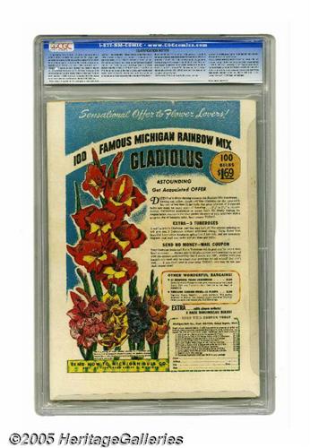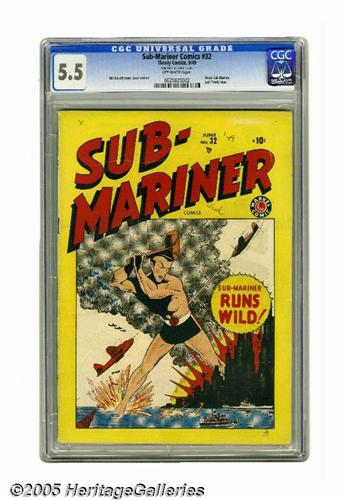 <B>Sub-Mariner Comics #32 (Timely, 1949) CGC FN- 5.5 Off-white pages.</B></I> This was the last Timely issue of this title, and it's "scarce" according to Overstreet. Appropriately, the story, cover, and art were handled by the character's creator, Bill Everett. Namor's origin was retold in this issue. CGC notes, "Tape stain on interior cover." Overstreet 2005 FN 6.0 value = $486. CGC census 6/05: 1 in 5.5, 3 higher.