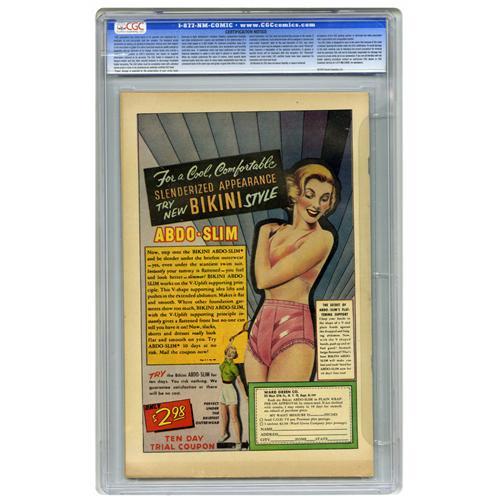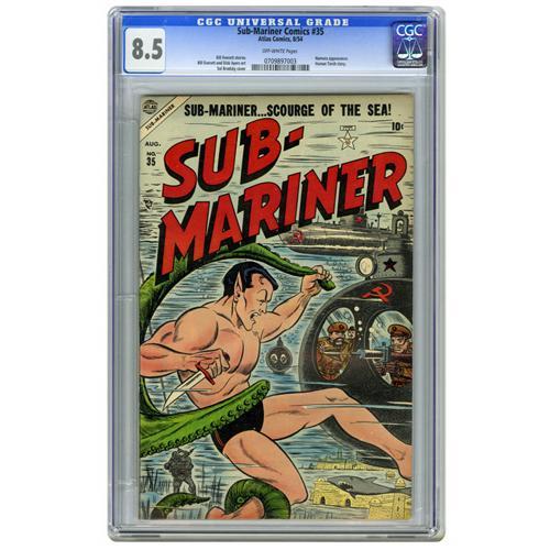 <B>Sub-Mariner Comics #35 (Timely, 1954) CGC VF+ 8.5 Off-white pages.</B></I> "Perhaps the best work of Bill Everett's 35-year career" is how Roy Thomas summed up the brief 1950s revival of this series. In addition to an "Atlanteans attack the surface world" yarn (with a Namora appearance), this issue's got a three-pager starring Namor as a young boy, and revealing a bit about his origin. There's also a Human Torch story drawn by Dick Ayers. The Cold War cover complete with Russian subs is by Sol Brodsky. Overstreet 2006 VF 8.0 value = $488; VF/NM 9.0 value = $769. CGC census 1/06: 1 in 8.5, 1 higher.