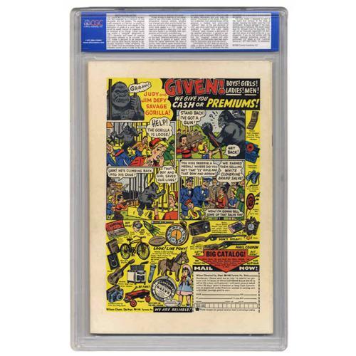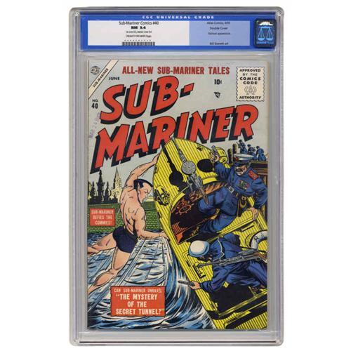 <B>Sub-Mariner Comics #40 Double Cover (Atlas, 1955) CGC NM 9.4 Cream to off-white pages.</B></I> Sub-Mariner creator Bill Everett pulled triple duty on this issue, drawing the cover and interior art as well as writing the story. It also features an appearance by Subby's female counterpart, Namora. This is the highest-graded copy certified by CGC to date, and the only one above 9.0. CGC notes, "1st cover 9.0, interior cover 9.4." Overstreet 2005 NM- 9.2 value = $975. CGC census 12/05: 2 in 9.4, none higher.
