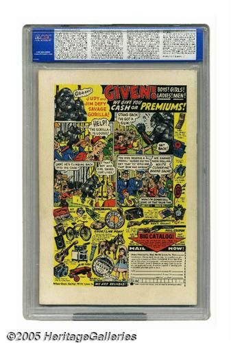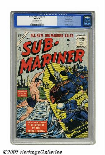 <B>Sub-Mariner Comics #40 Double Cover (Timely, 1955) CGC NM 9.4 Cream to off-white pages.</B></I> Sub-Mariner creator Bill Everett pulled triple duty on this issue, drawing the cover and interior art as well as writing the story. It also features an appearance by Subby's female counterpart, Namora. This is the highest-graded copy certified by CGC to date, and the only one above 9.0. CGC notes, "1st cover 9.0, interior cover 9.4." Overstreet 2005 NM- 9.2 value = $975. CGC census 7/05: 1 in 9.4, none higher.