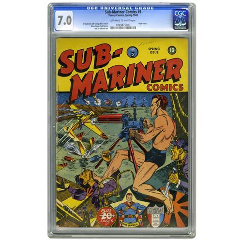 <B>Sub-Mariner Comics #5 (Timely, 1942) CGC FN/VF 7.0 Off-white to white pages.</B></I> Al Gabriele is credited with the art for this issue's Japanese war cover. Kids sure got a lot for their money here -- if 38 pages of Subby weren't enough for them, the backup feature starring the Angel ran for a whopping 20 more! Overstreet 2006 FN 6.0 value = $867; VF 8.0 value = $1,806. CGC census 4/06: 1 in 7.0, 4 higher.