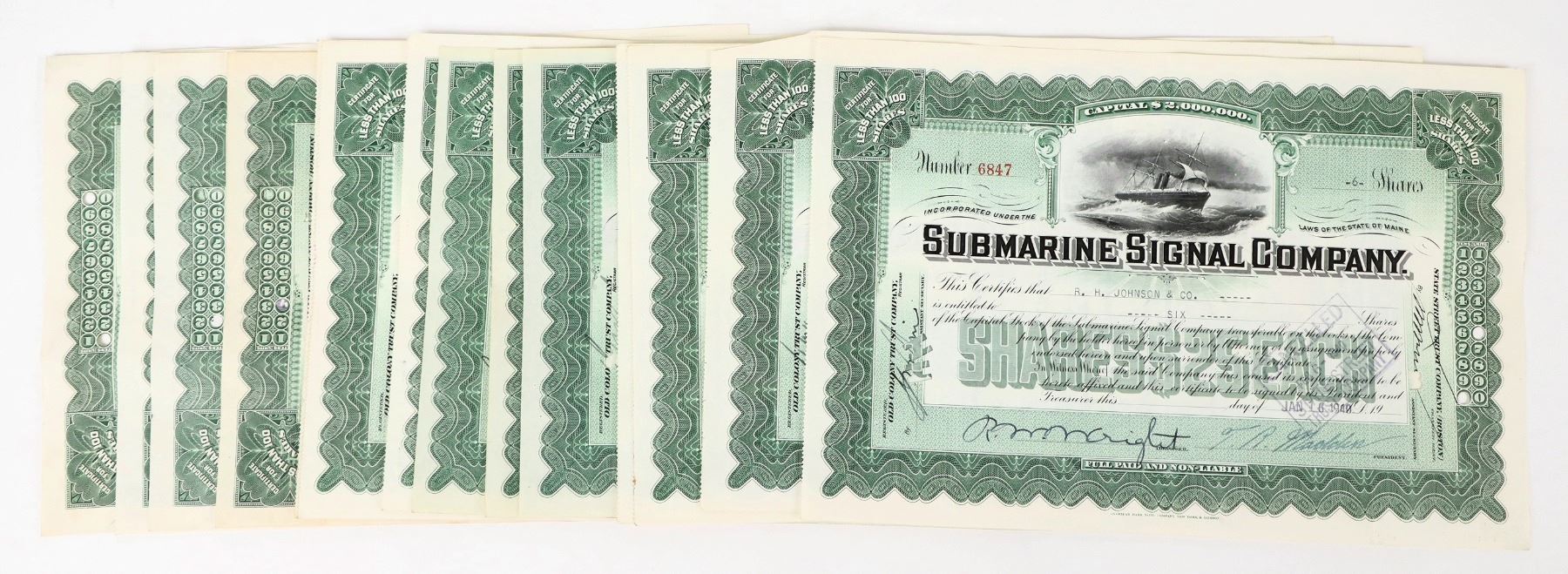 Lot of 14 stocks issued 1918-1940, stamp cancelled. Green border, black print, and vignette of ship. ABN. The company was organized in 1901 and manufactured underwater bells and encased microphones for sound detection on the ships (The Journal of the Acoustical Society of America 137, online). The company merged into Raytheon in 1946.