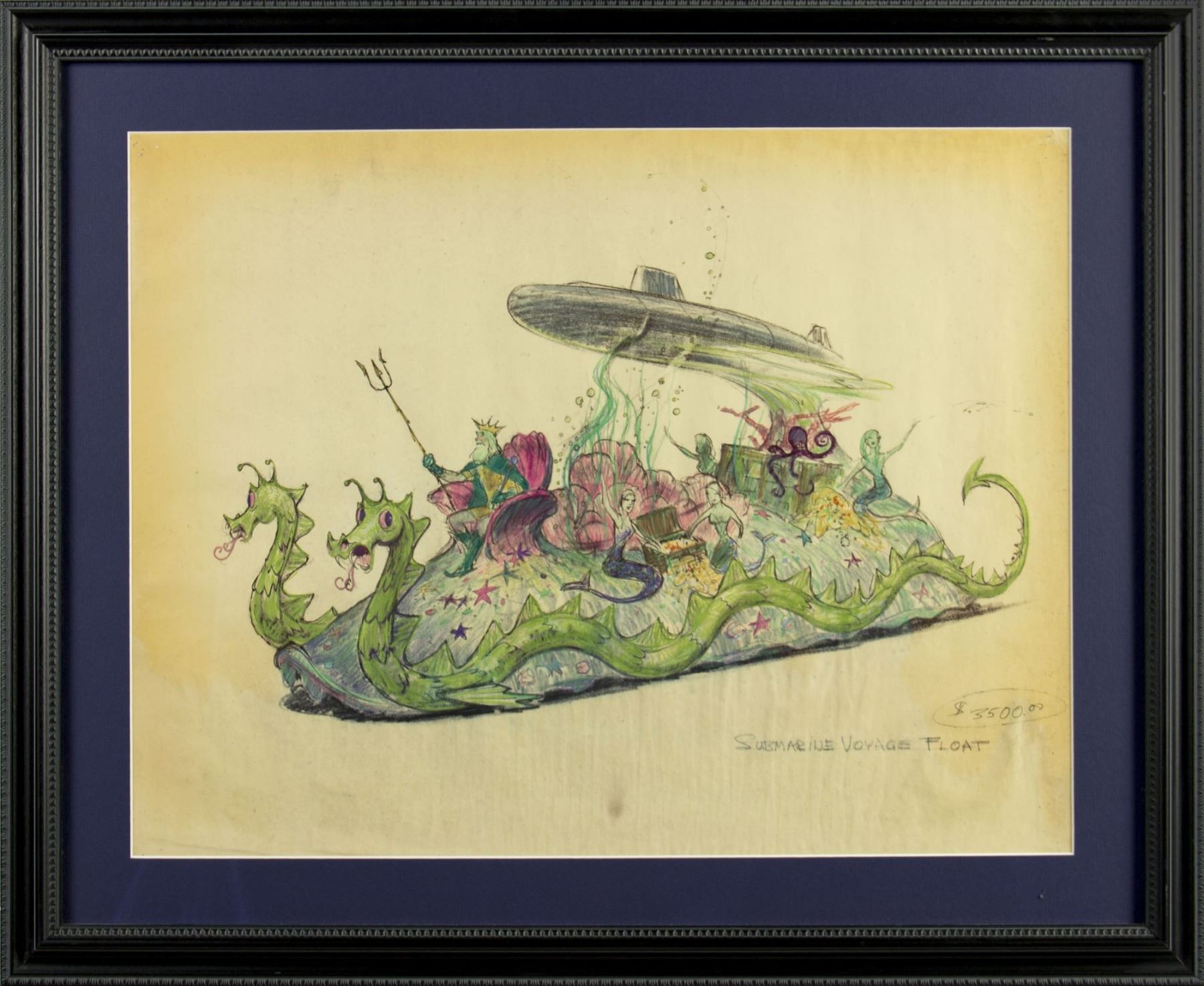 (Disneyland, 1959) An original hand-colored concept brownline for a float design featuring the "Submarine Voyage" attraction. This float design was created for the 1959 "Grand Re-Opening" of Disneyland which debuted such attractions as the "Matterhorn", "Submarine Voyage", and "Monorail". This brownline measures 19"x25" and is in good condition with some minor wear throughout including yellowing around the edges.