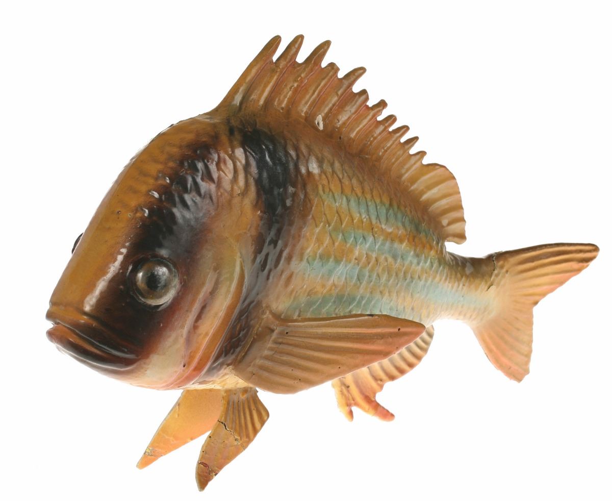 (Disneyland, 1960s) Charming yellow fish with blue and brown stripes used in the "Submarine Voyage" attraction at Disneyland. Measures 8"x12" and 3.75" thick. In fair-good condition with some chips to the paint and a few breaks to some of the fins.