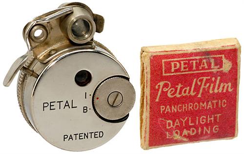Subminiature Camera "Petal", 1948 Petal Kogaku, Japan. Round body, "Made in occupied Japan", with additional film in original box.<Br>