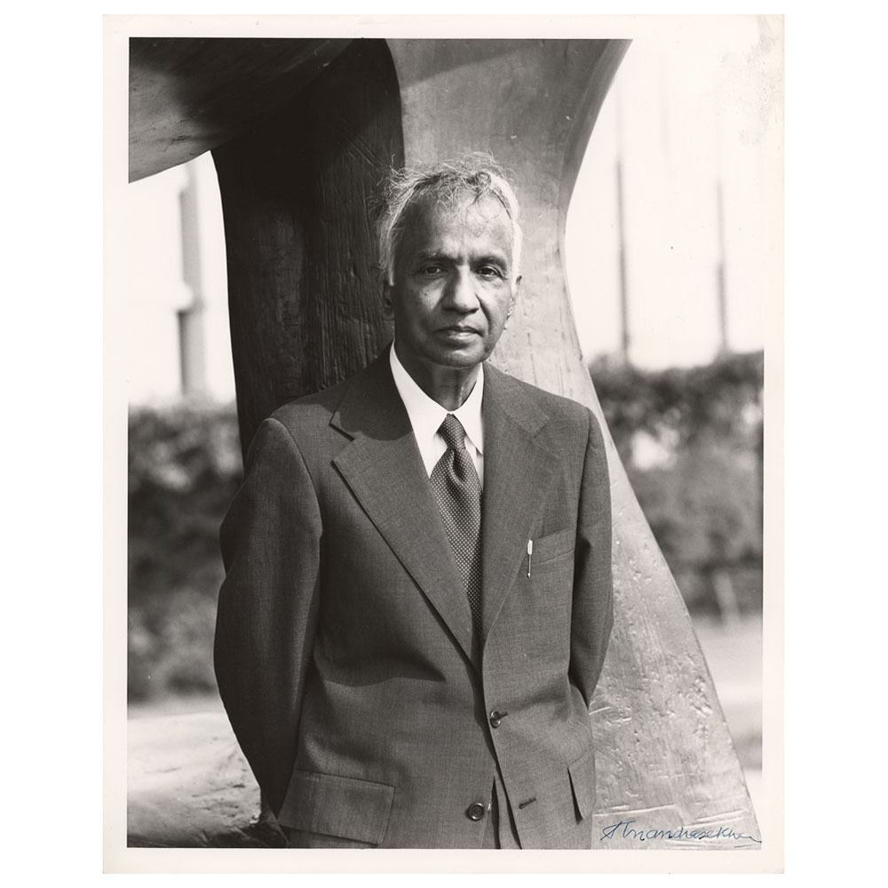 Glossy 8 x 10 half-length photo of Subrahmanyan Chandrasekhar posing outdoors in a fine suit, signed in black ink, “S. Chandrasekhar.†In fine condition.