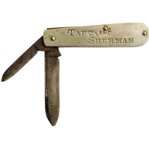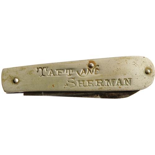 <B>Substantial 1908 Taft & Sherman Pocket Knife.</B></I> Two blades fold into this heavy knife having the candidates' names stamped onto one side. The case has smooth, bright surfaces with a few small dings from use, else fine condition. 3.5" overall length when closed. We have not encountered this item before. Should excite interest from both political and pocket knife collectors.