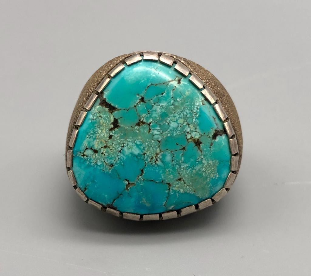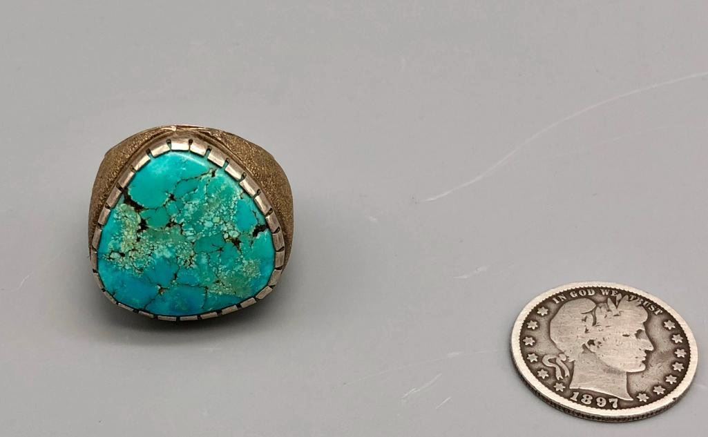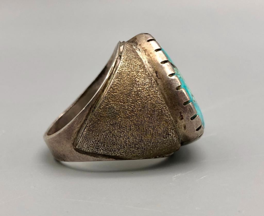 Presented for sale in this lot is this substantial Spiderweb turquoise and sterling silver ring. It has unique textured sides on the upper shanks, set with a stunning Spiderweb turquoise stone in a handmade bezel. Made from sterling silver. MAKER: Unmarked. APPROX AGE: Vintage. SIZE: 11.5. Measures 1 inch across. Weighs 25.2 grams. CONDITION: Good for its age, normal wear expected. Please look closely at the pictures as they are an important part of our description and are hereby incorporated into the description, specifically with regards to condition. SHIPPING: There will be a $5 handling / packaging fee for shipping this lot. The actual cost of postage will be added on top of that. BUY IT NOW: If you would like to buy this item now, without waiting for the auction day to bid on it, we do offer this option (which is available up to 48 hours before the actual auction starts). The “Buy it Now” price is the high estimate of this lot (plus applicable fees and the Buyer's premium is discounted to 10% when using the Buy it Now option). If you would like to exercise this option, you must contact us by email (or phone as long as you talk to someone live). Reference this lot number and your intention to "Buy it Now."