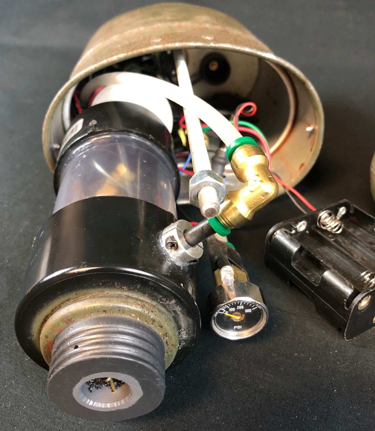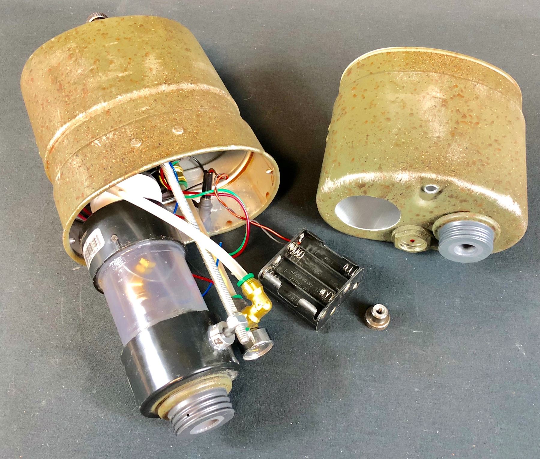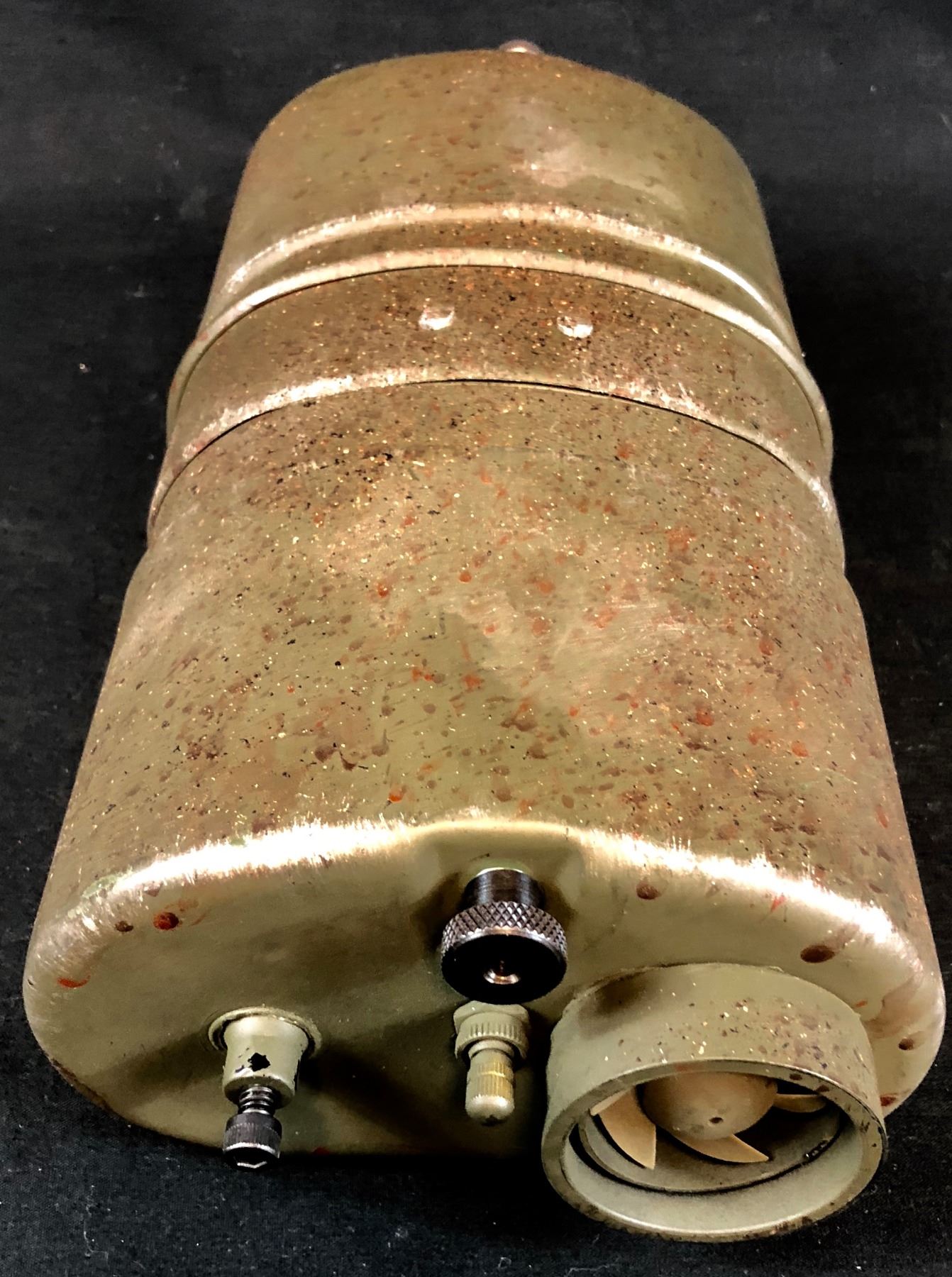 Worn by the soldiers, these packs are made from metal and textured with paint to appear worn from battle. It includes original mechanical components within the casing that when powered by batteries, were designed to emit steam through a built in vent fan. The electronic and mechanical elements of this unit remain untested. Measuring 6.5" x 4" x 14".