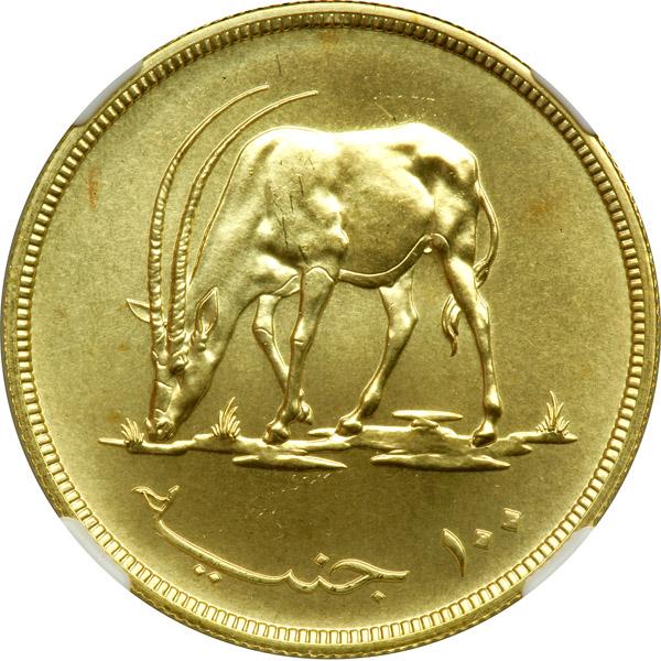 Sudan. 100 Pounds, AH1396 (1976). Fr-2; KM-72. Weight 0.9675 ounce. Mintage 872 pieces. Conservation. Scmitar-horned oryx. NGC graded MS-64.