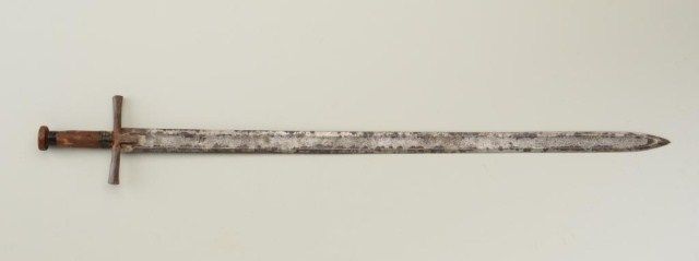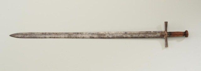 Sudanese sword approx. 41” overall in uncleaned condition showing scattered areas of erosion on blade, iron cross guard, leather wrapped grip with leather wrapped circular pommel. Est.: $150-$300.