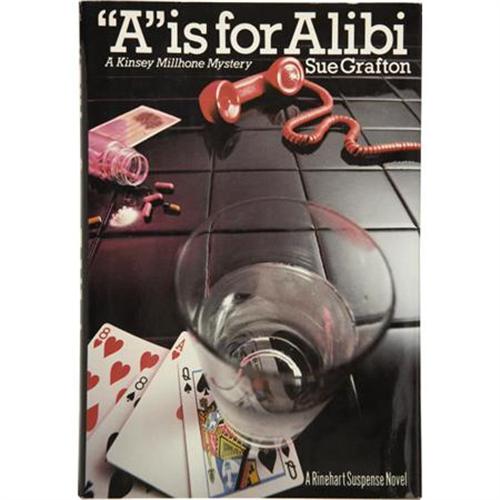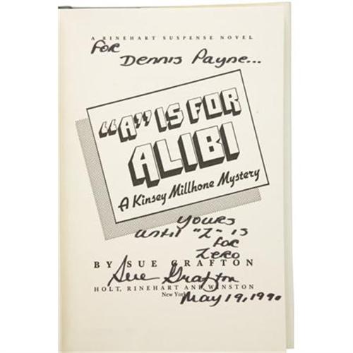 <B>Sue Grafton. </B></I><B><I>"A" is for Alibi. </B></I></B></I><I>A Kinsey Millhone Mystery.</B></I><B><I> </B></I></B></I>New York: Holt, Rinehart and Winston, 1982. <BR> <BR>First edition, first printing. Inscribed by the author on the title page in 1990 and signed on a bookplate as well. Octavo. 275 pages.<BR><BR>Dark gray cloth with red spine titles. In pictorial dust jacket. Clean, crisp, bright first edition. Just one tiny .25 inch tear of the dust jacket at the bottom of the rear panel spine fold. Overall fine condition.<BR><BR>Initial flyleaf bears Grafton's bookplate with her signature (which appears to have been copied over at a later time). On the title page, the author has inscribed the book: "For Dennis Payne...Yours until 'Z' is for Zero. Sue Grafton, May 19, 1990<I>.</B></I>"<I> </B></I>A scarce title in collectible condition from a wildly popular mystery series. <I>From the Robert and Diane Yaspan Collection.</B></I><BR><BR><b>Shipping:</b> Books & Catalogs (<a target="_blank" href="http://www.heritageauctions.com/common/shipping.php">view shipping information</a>)
